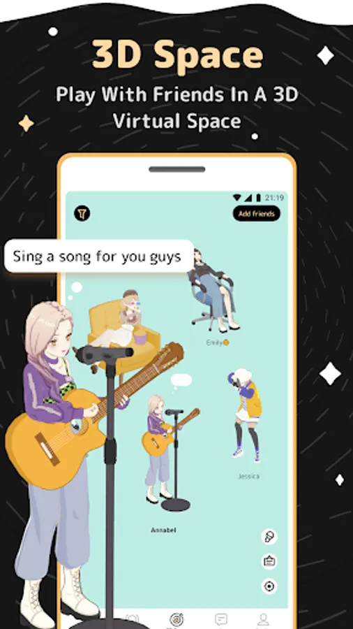 Choose your 3D avatar and play party games in the voice room! Turn on your mic and vibe with your friends. Tons of party games are coming soon!