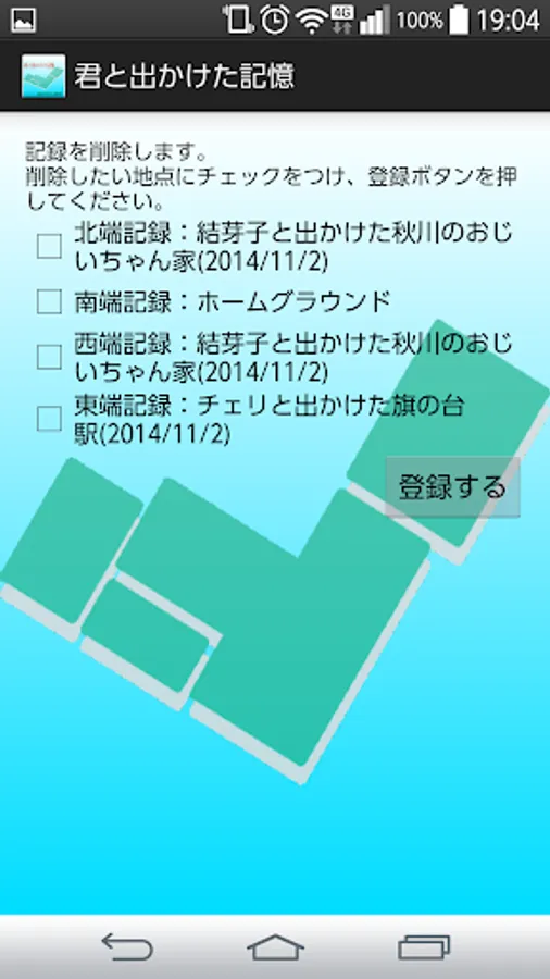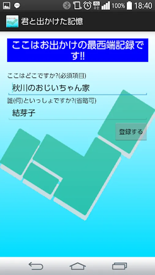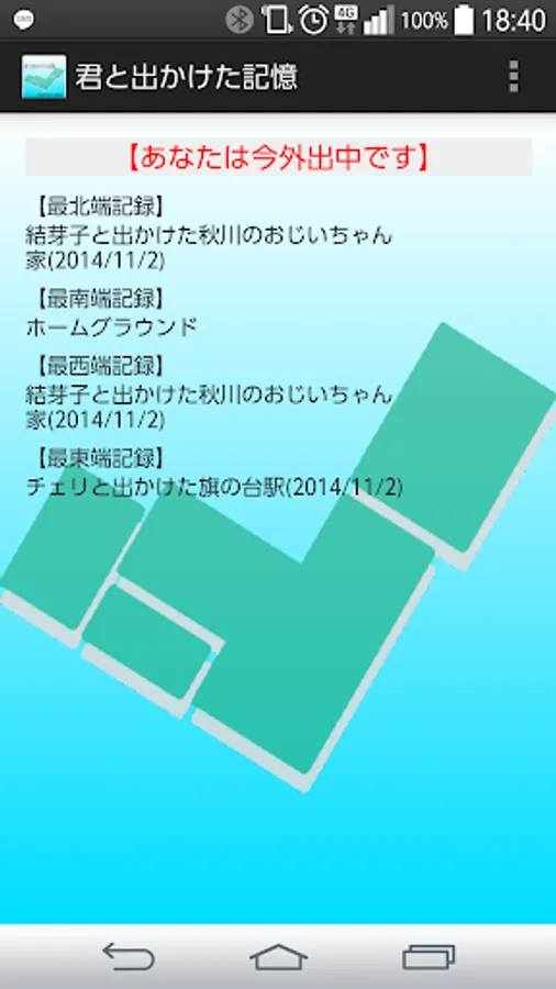 「最北端」「最南端」「最西端」「最東端」だったときにその場所と、「誰と一緒だったか」を記録できます。