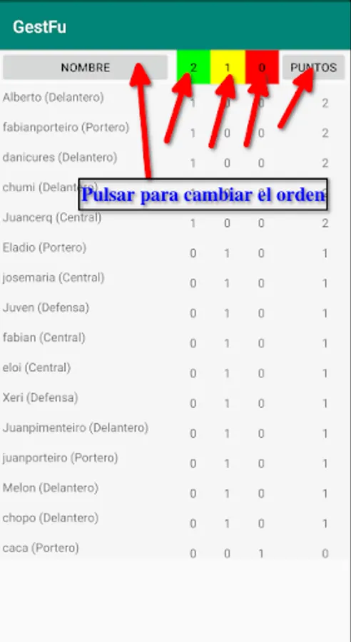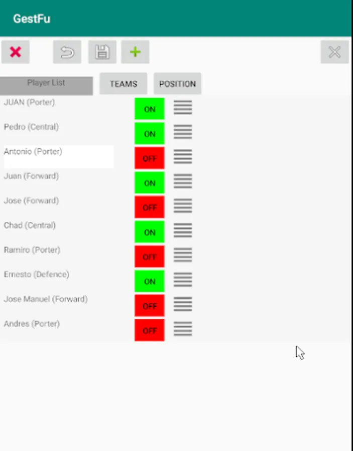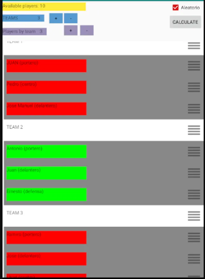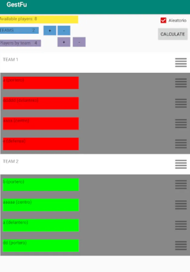 This free version allows the user to add many players without limit, and then make teams in a balanced way (calibrating the strength of each one subjectively by the user, the more properly calibrated the teams the program). It allows you to make them randomly, based on 5 possibilities: the individual technical level, the defensive force, the game and collaboration with the team and the possibilities in attack. The fifth possibility would be the average of all these. This allows the group of friends to quickly make different teams balanced and random. Or, a football coach with many players will be able to do balanced training matches. At all times when making teams you can make adjustments by moving players or deleting. The four default positions: goalkeeper, defense, center, striker. You can also add or rename them. The doorman can't be removed. Yes change the name. In the first round when making balanced teams I hand out the goalkeepers for each team if there are.