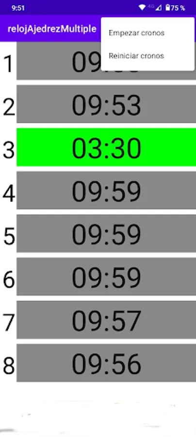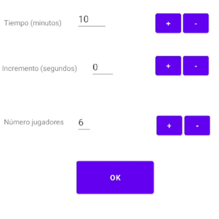 Simple program for timing multiplayer board games to prevent one player from overthinking. When one of the players' time runs out, they will no longer be able to continue playing because they would be eliminated. Simply choose the number of players (1 to 8), the time per player (in minutes) and if you want an increase in seconds so that when the time is about to run out you can have an extra each time you press on your turn.