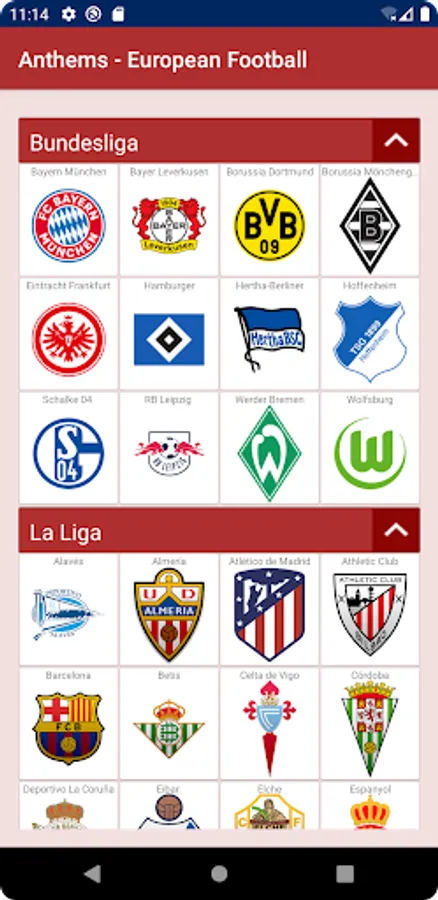 La Liga: Alavés, Almería, Atlético de Madrid, Athletic Club, Barcelona, Betis, Celta de Vigo, Córdoba, Deportivo La Coruña, Eibar, Elche, Espanyol, Getafe, Girona, Granada, Hércules, Huesca, Las Palmas, Leganés, Levante, Málaga, Mallorca, Numancia, Osasuna, Racing Santander, Rayo Vallecano, Recreativo