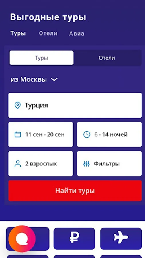 The free mobile travel agency application is a unique search for current tours and ONLINE booking in two clicks. Purchase without registration. Payment by card or QR directly in the application. 0% commission for transfer via SBP.