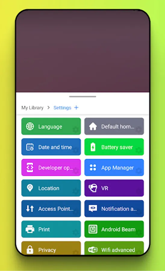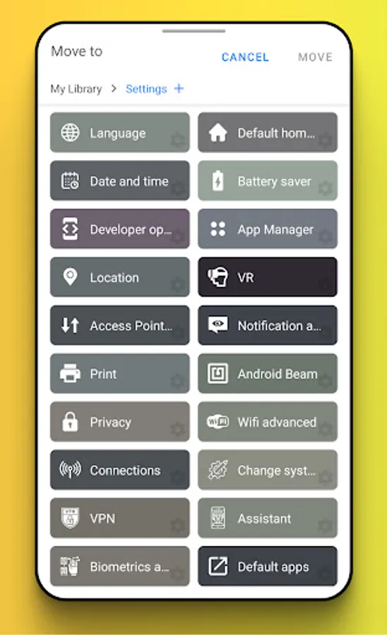 Various settings in your phone (Language,Default home app,Date and time,Battery saver,Developer options,App Manager,Location,VR,Access Point Names,Notification access,Print,Android Beam,Privacy,Wifi advanced,Connections,Change system settings,VPN,Assistant,Biometrics and security,Default apps,Appear on top,Storage,Network operator,Mobile networks,Fingerprint,Screen saver,Data usage,Captioning,Keyboard,Wallpaper,Audio Effect,Password,Display,Bluetooth,About phone,Accounts,WLAN,Sound and vibration,NFC,Cast Setting,Accessibility,Tap and pay,Airplane mode)