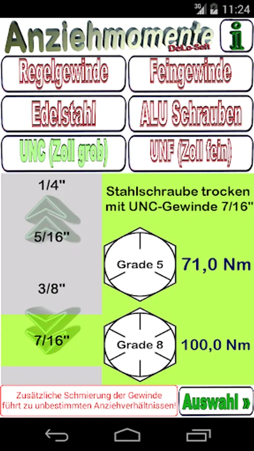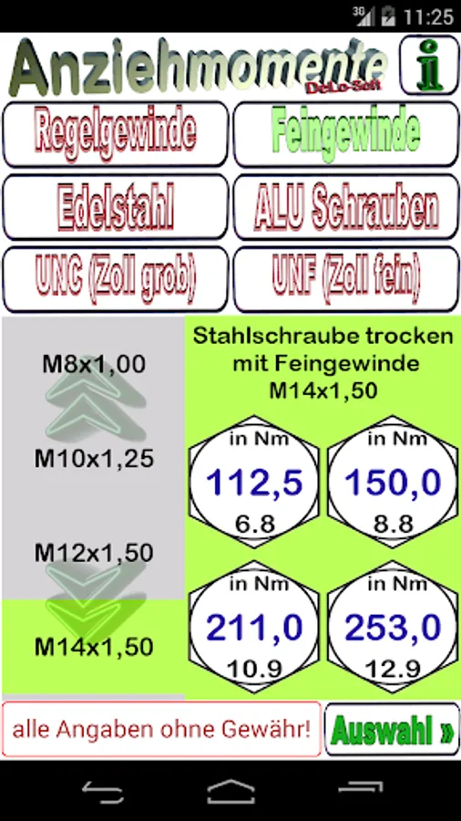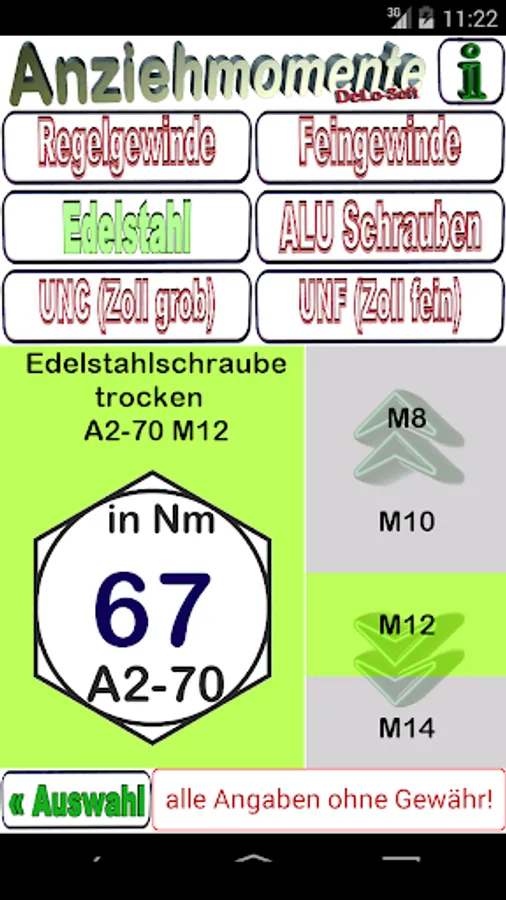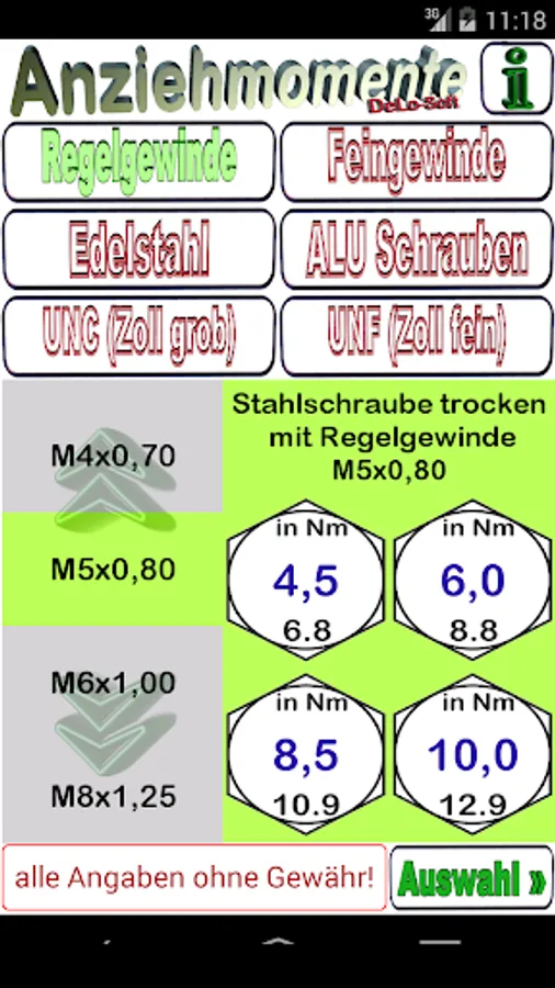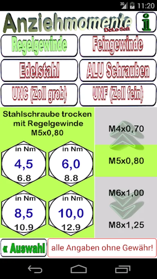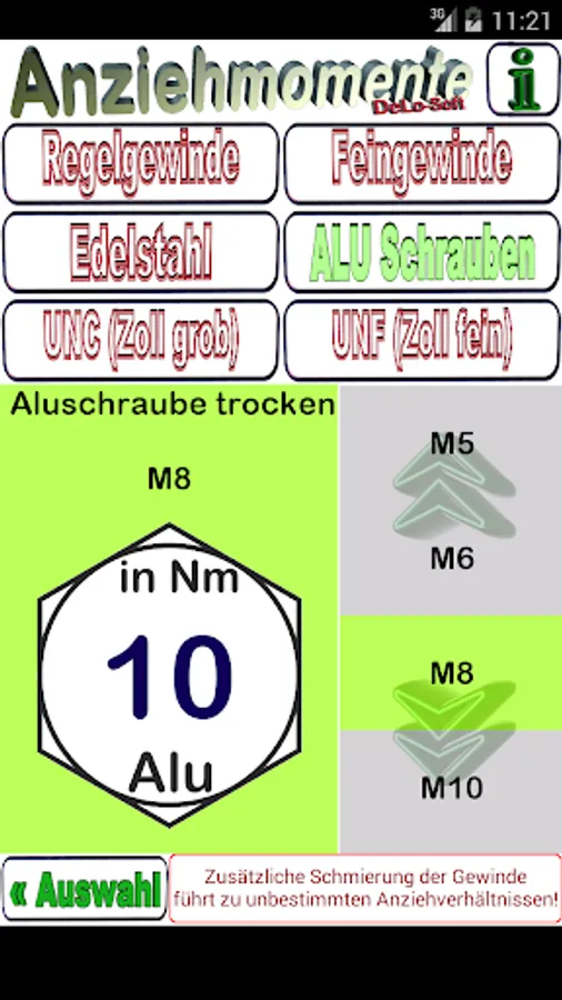 This tool finds the correct torque. Different strength classes are considered. Quickly find the correct tightening of screws with standard thread sizes of control and fine threads and UNC and UNF thread.