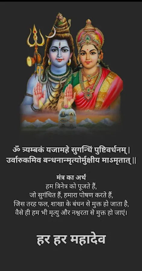 महामृत्युंजय मंत्र का उल्लेख ऋग्वेद से लेकर यजुर्वेद तक में मिलता है। संस्कृत में महामृत्युंजय उस व्यक्ति को कहते हैं जो मृत्यु को जीतने वाला हो। इसलिए भगवान शिव की स्तुति के लिए महामृत्युंजय मंत्र का जप किया जाता है। इसके जप से संसार के सभी कष्ट से मुक्ति मिलती हैं। ये मंत्र जीवन देने वाला है। इससे जीवनी शक्ति तो बढ़ती ही है साथ ही सकारात्मकता बढ़ती है। महामृत्युंजय मंत्र के प्रभाव से हर तरह का डर और तनाव खत्म हो जाता है ।