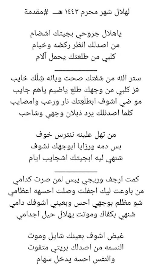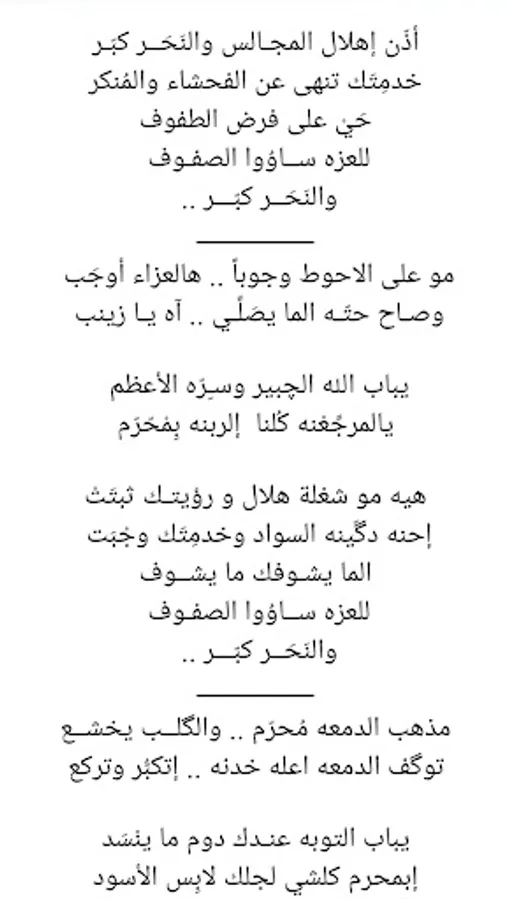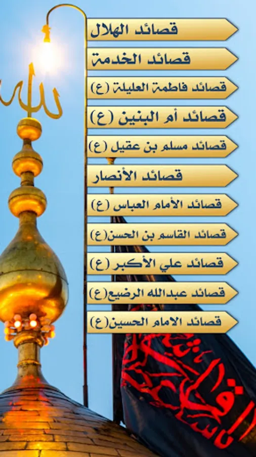 Poems of the crescent and poems of the night of Fatima al-Aleila, peace be upon her, poems of service or servants, poems of the night of Umm al-Banin, peace be upon her, poems of Muslim bin Aqeel, peace be upon him, poems of the Ansar, Abi al-Fadl al-Abbas, peace be upon him, al-Qasim ibn al-Hasan, peace be upon them, poems of Ali al-Akbar and Abdullah the infant, peace be upon them, and poems of Imam Hussein, upon him be peace The best prayer and delivery, and poems are added continuously, God willing