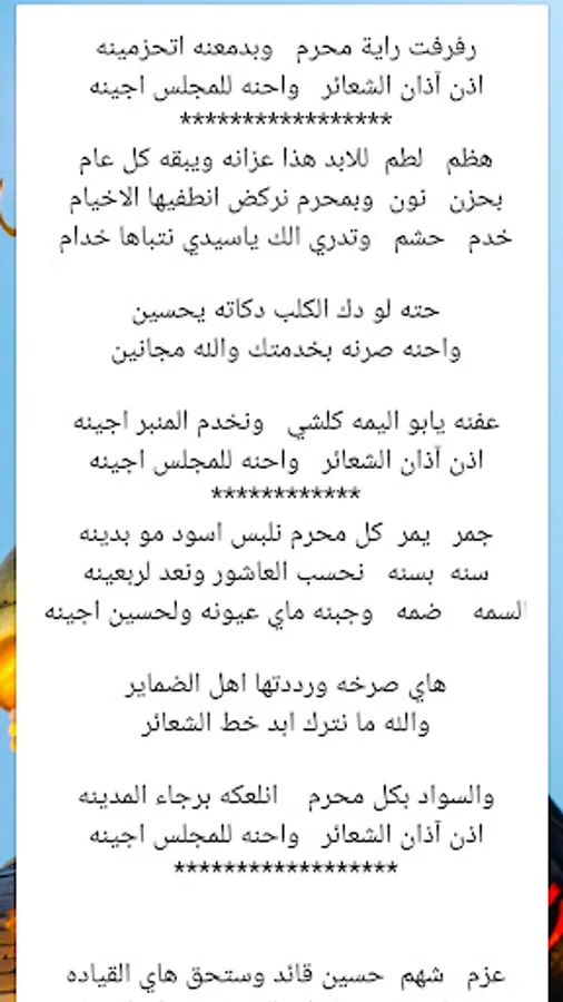 Hussainiya written poems is an application that contains hundreds of poems of all kinds, including introductions, basics, catastrophes, scarecrows, shuras, and obituaries for each night of the month of Muharram, arranged to make it easier for you to choose what suits you and what you need