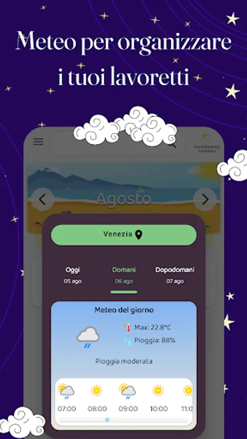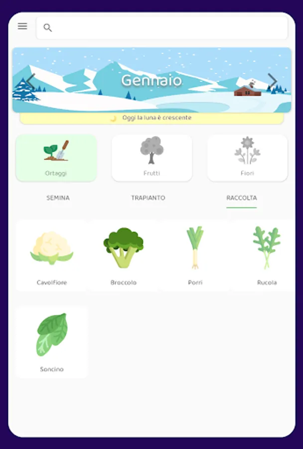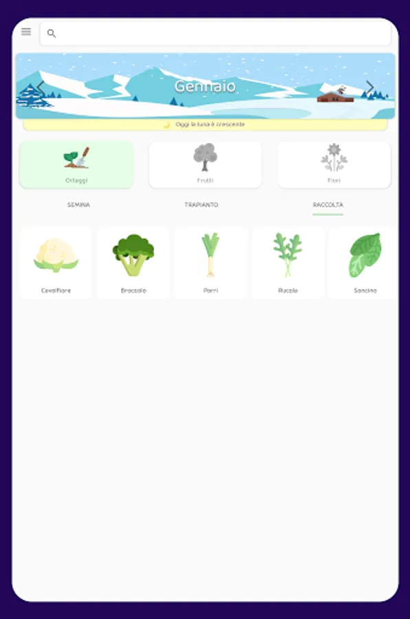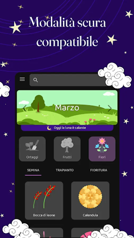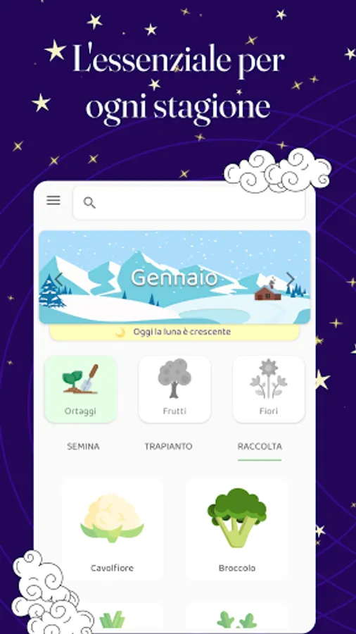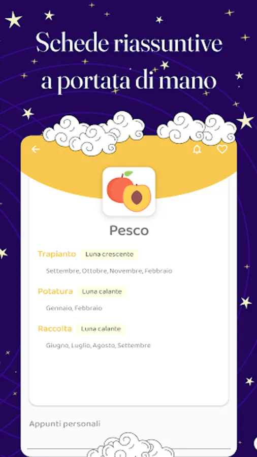 You can also write your personal notes in the dedicated space in the cards of each vegetable, fruit and flower and activate the bell to receive reminder notifications on the best times to benefit from the influence of the moon.