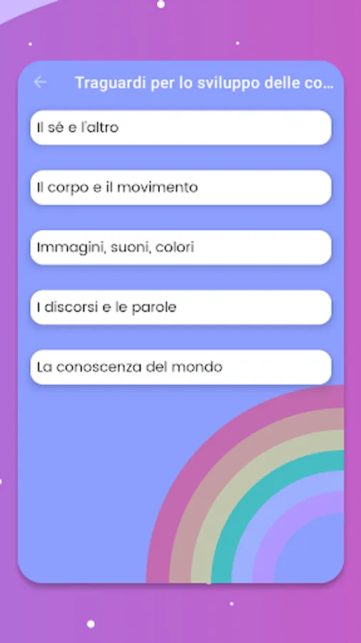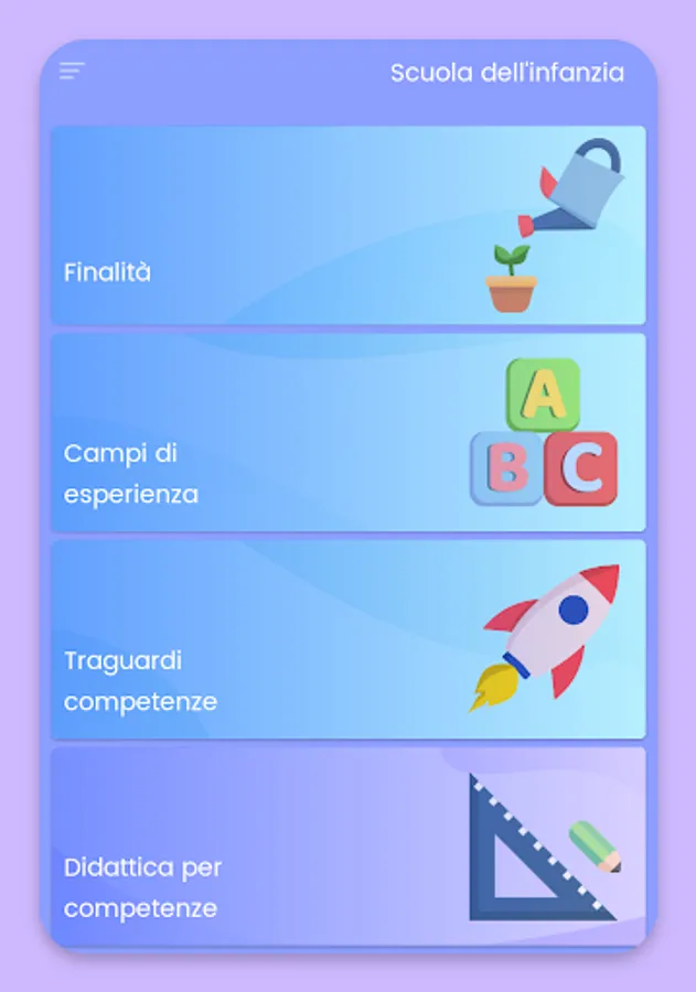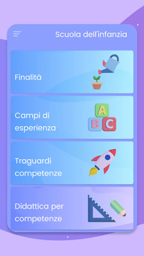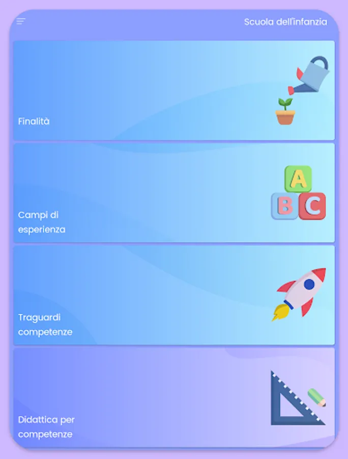 National indications for kindergarten (as 2021/22) is an application that contains the salient points of the "Regulation containing national indications for the curriculum of kindergarten and the first cycle of education, pursuant to article 1, paragraph 4, of the decree of the President of the Republic March 20, 2009, n. 89 "(decree no. 254) relating to educational programming in kindergarten.