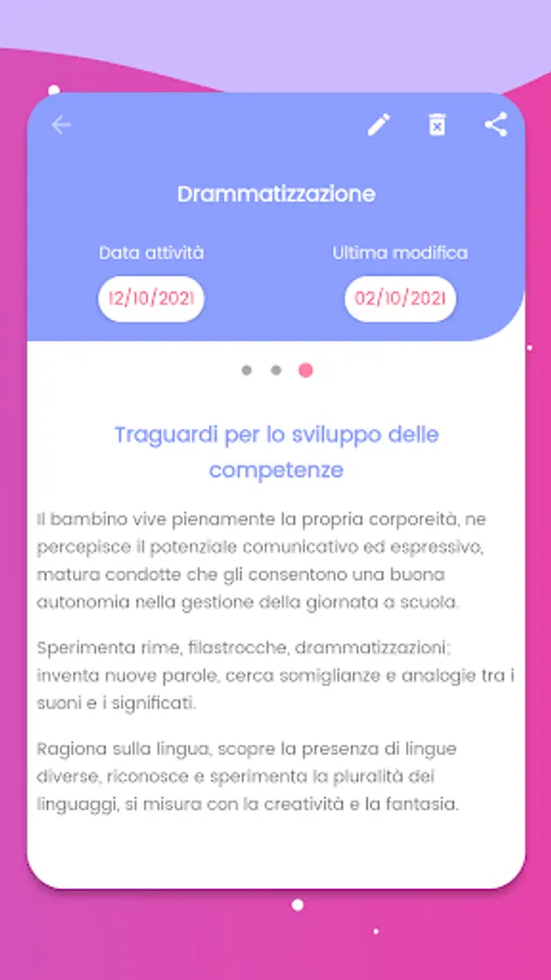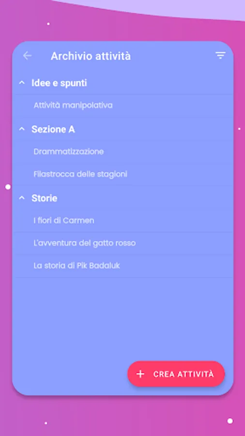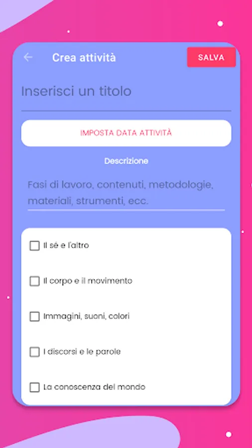 • the activity creation function with which each teacher can plan with reference to the national guidelines and, if desired, share their notes with colleagues. In this sense, it will be possible to design entire UDAs (Didactic Learning Units). All the activities will give rise to their own personal didactic archive;
