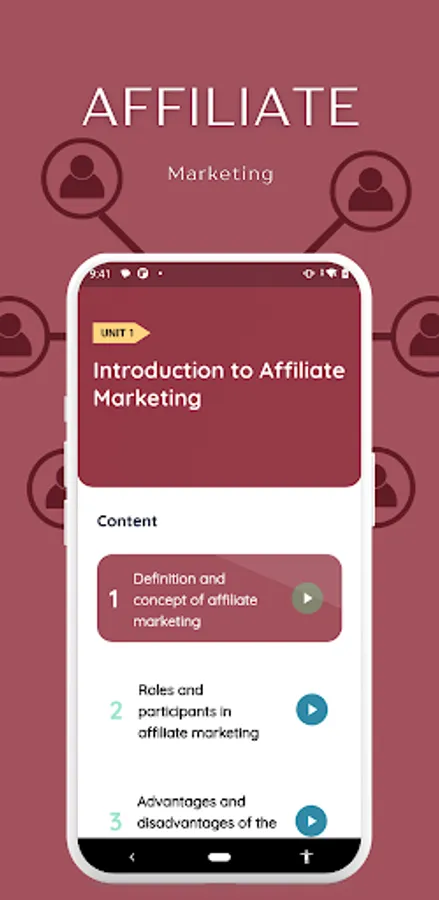 Introduction to Affiliate Marketing In this initial unit, you will learn the basics of affiliate marketing, including its definition and the key roles in this business model. You will also explore the advantages and disadvantages, which will help you make informed decisions.