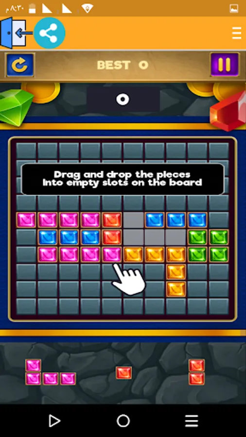 • Jewels Blocks Puzzle is simple yet addictive classic jewels game. The block sin different shapes are waiting for you! Your task is to create horizontal lines with the given blocks, when you make a line, it is cleared from the screen. The more you cleared, the higher score you will obtain. If there is no room for the given block in the screen, the game is over. You had to think twice before you putting these blocks. Choose the best position for each block depending on their shapes. It is really a casual puzzle game for your free time. You can't stop playing it once you start the game!