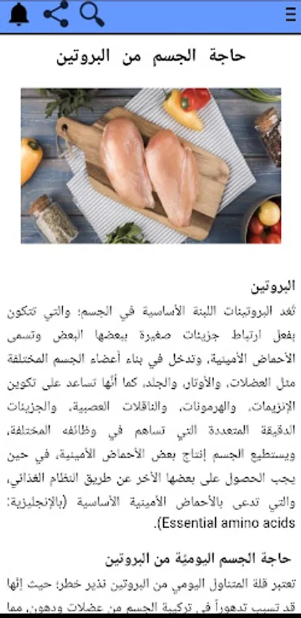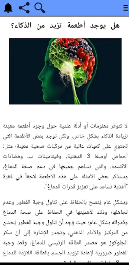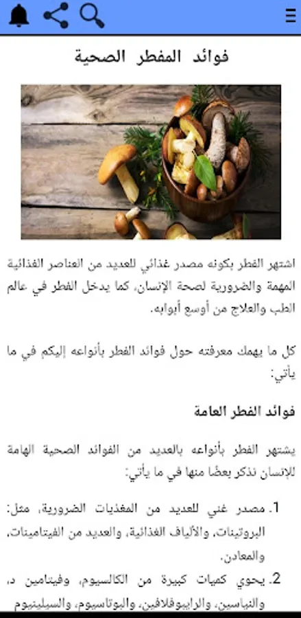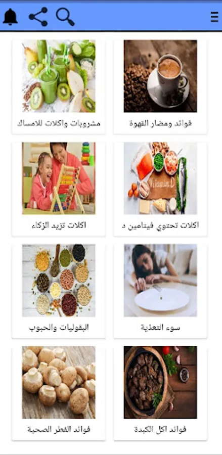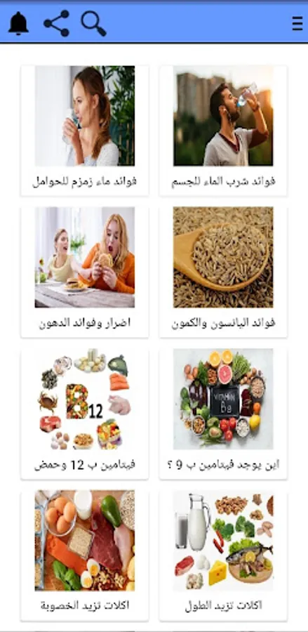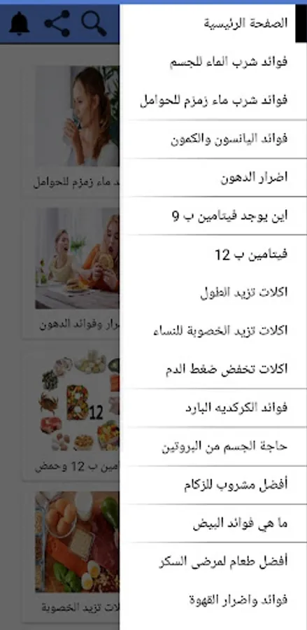 The application contains a set of sections, including: the benefits of drinking water, the harm and benefits of fat, where is vitamin B12 found, foods that increase height, foods that increase fertility for women, the benefits of anise and cumin, foods that reduce pressure, the benefits of hibiscus, the body's need for protein, the benefits of eggs, The benefits of liver, foods that increase zakat, the benefits of mushrooms, malnutrition, drinks and foods for constipation, and others ....