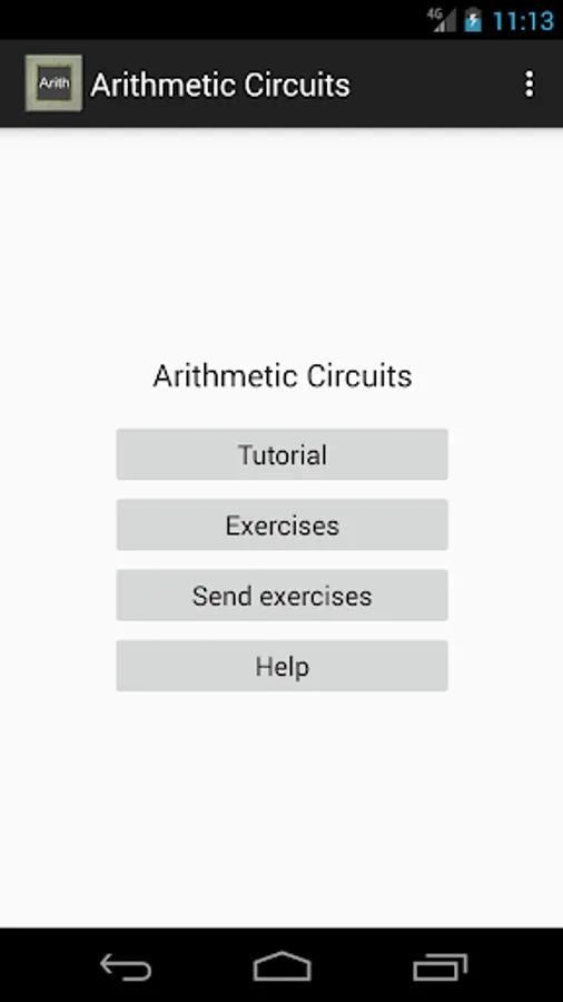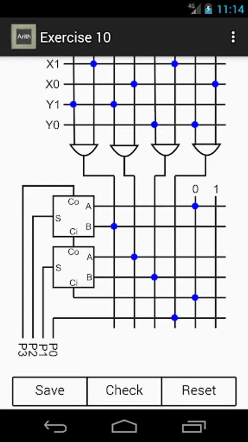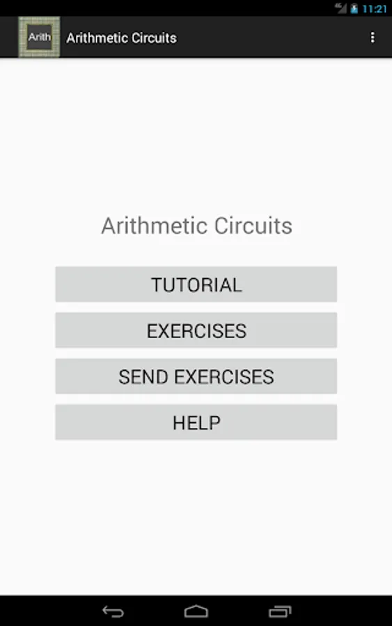 The user can save exercises solutions and send them by email, so that the receiver can load them in "Arithmetic Circuits" app. Basic manual (help) for utilize this app is included.Tutorial about combinational circuits is included.