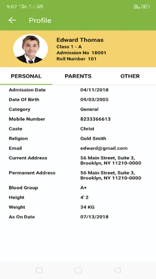 Student profile consist 360* student record with admission, personal, contact, fees, exam and document details.