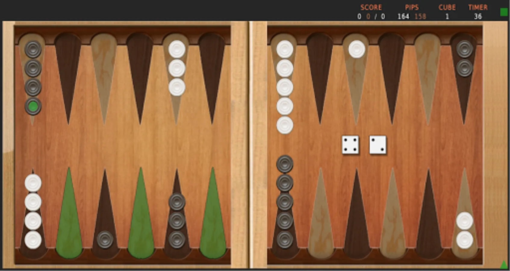 The score, pip count and the cube value is displayed on the top side.