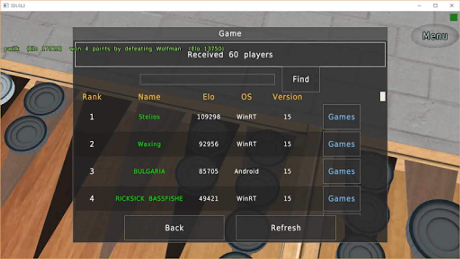 Network communication uses non-blocking TCP sockets using select pooling for high throughput, allowing the app to resume games while the client changes IP addresses. You will almost find a lot at least 70 players connected to the server. As time passes, it will replace FIBS by creating multiple clients on different devices (desktop, phones, smart TVs).