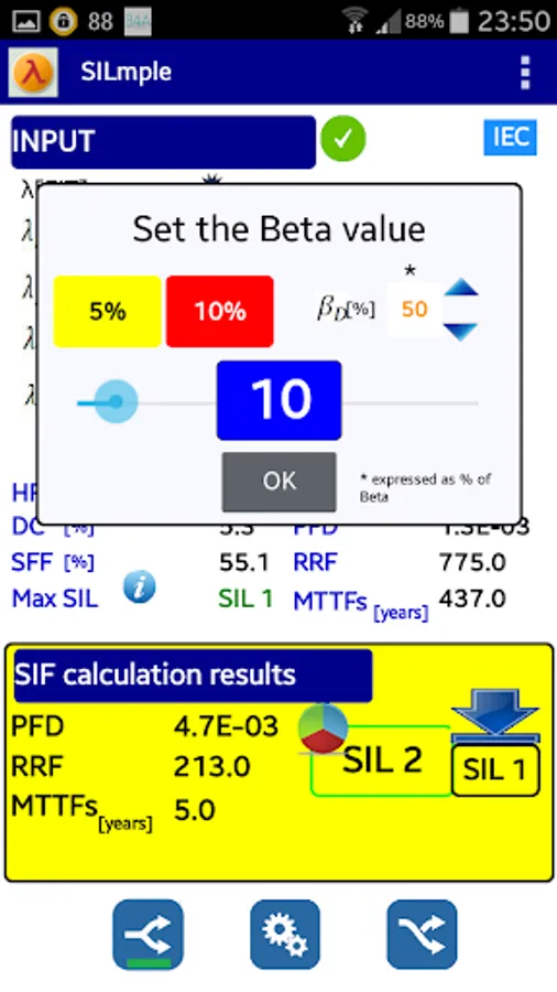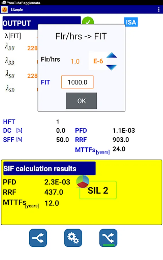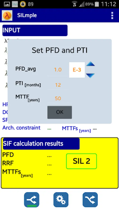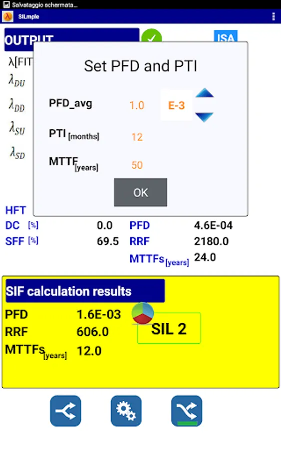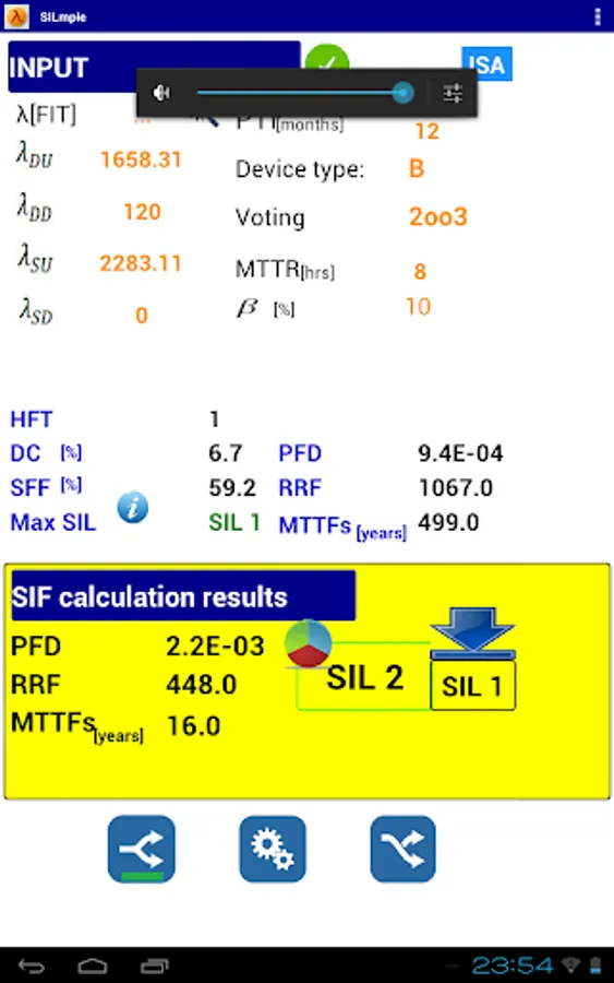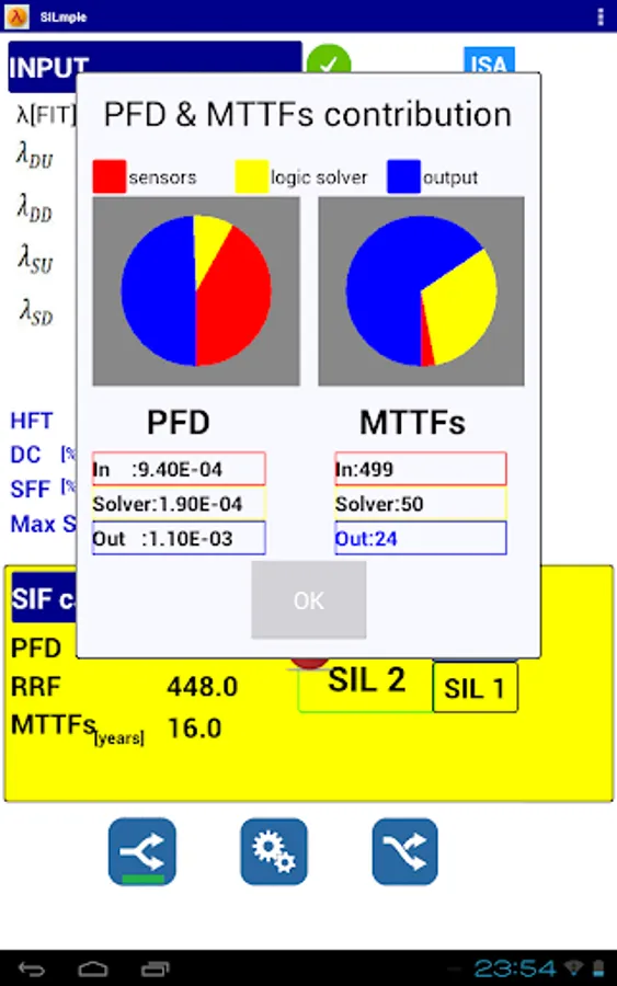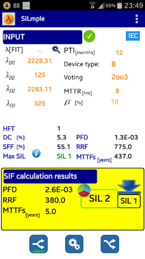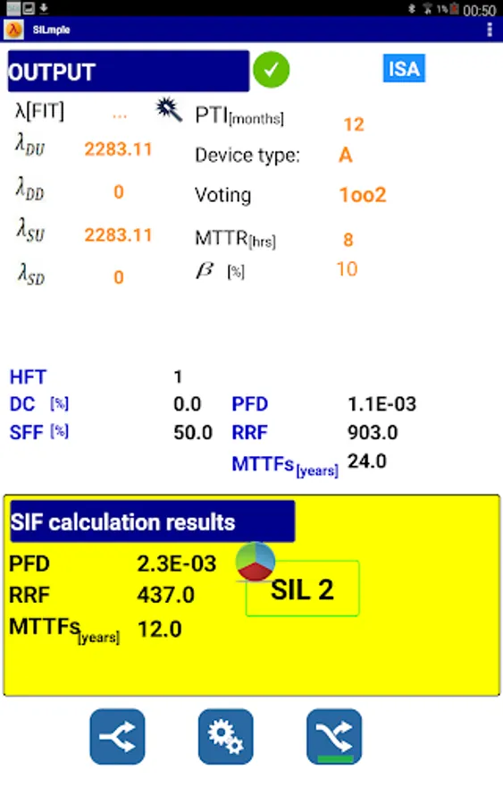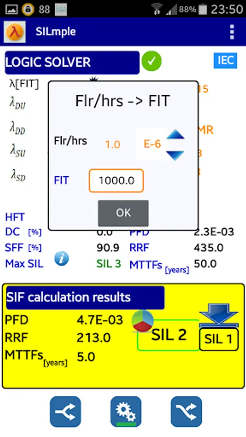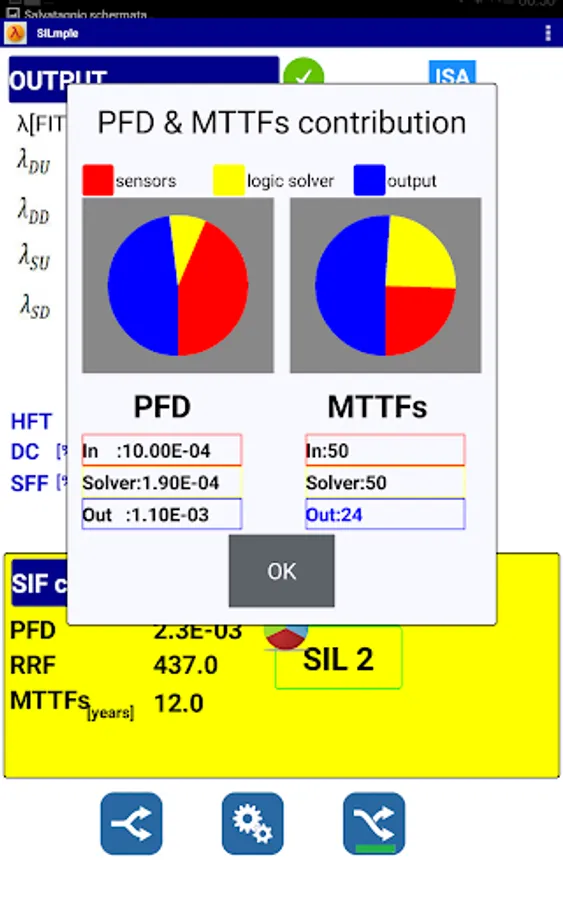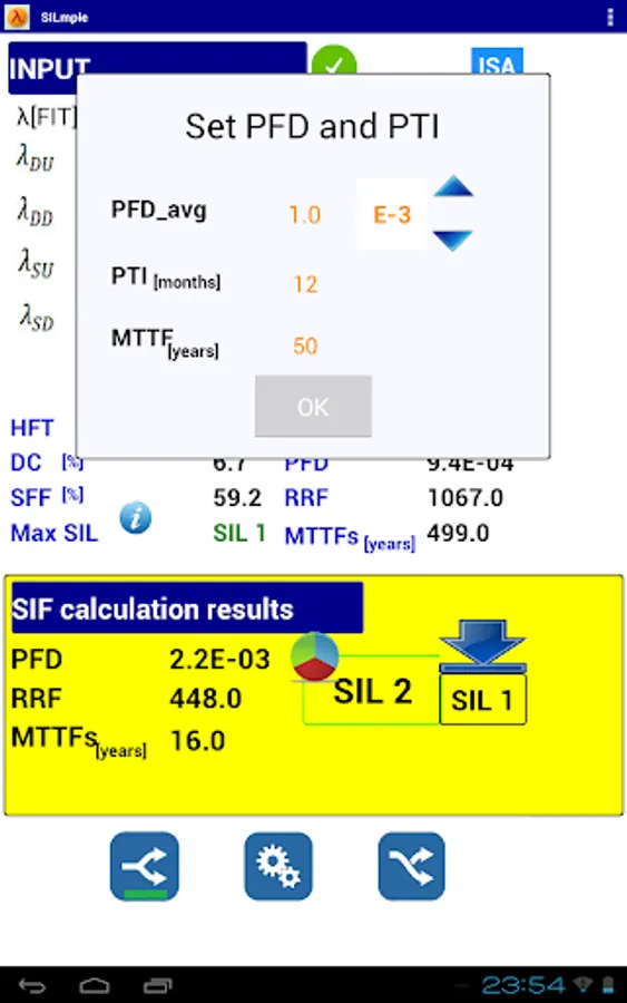 This APP allows the SIL (PFD and RRF) calculation of a SIF modelled as input+logic solver+output. It also calculates the MTTFs as per ISA-84 formulae. The inputs for the calculations are the failure rates in FIT (the app provides a converter from flr/hrs) and a simple wizard to calculate Lambdas from PFD, Proof test interval and MTTF. Addittionally it calculates, given the HFT and the SFF, the architectural constraints supporting both IEC-61508 and IEC-61511 tables. The APP can save and restore csv backups.
