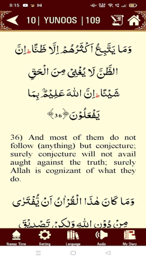 Additional features like Namaz Time, Qiblah, Azaan, Islamic Events, Tasbeeh Counter, Audios, Bookmark, Favorites, Recitation Records, etc makes this app a definite spiritual companion.
