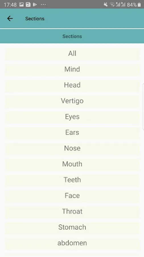- Remedy list (about 350) with associated symptoms