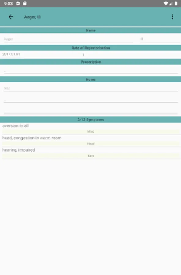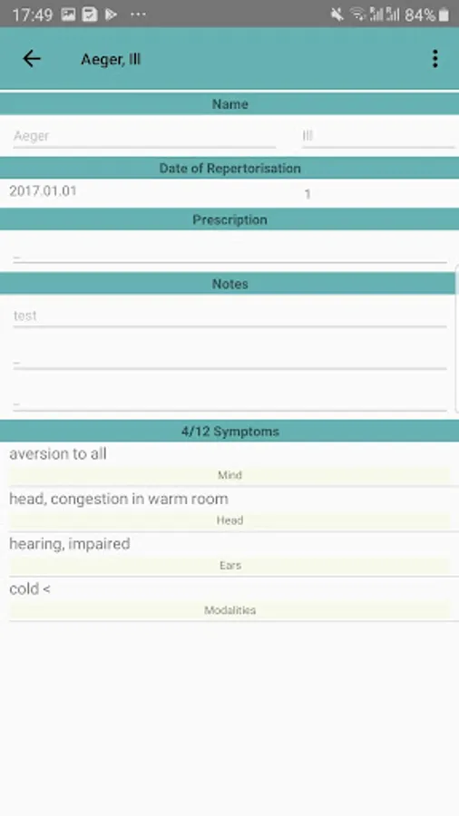 - Case recording with repertorisation for determining a suitable remedy; 14 symptoms/case