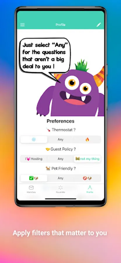 At RuumMe we offer a familiar matching experience that you can cater to your specific interests for the things that actually matter to you. Anything from thermostat preferences and guest policies to whether like luxury amenities or affordable values.
