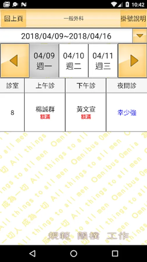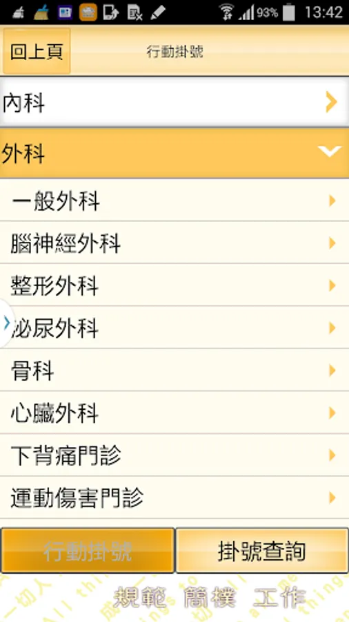 行動掛號 : 簡單、明瞭呈現醫師門診班表,依照需求點擊科別、時間即可完成掛號。