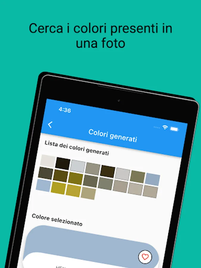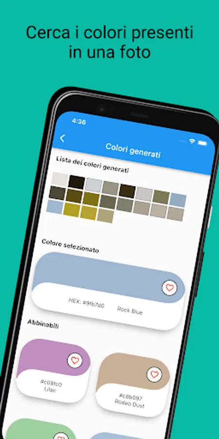 Take a picture or recall it from your gallery, select the color you need to match: you will get a screen with a palette of colors and, for each of them, the combinable and complementary ones with code and name.