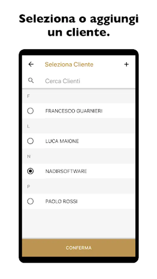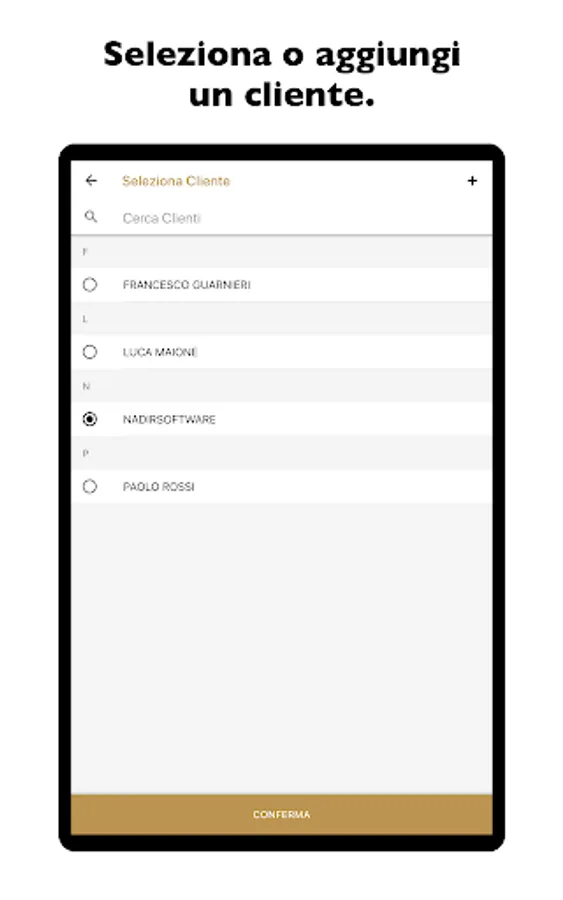 Select a customer or add a new one to start the order. If you are the owner of the company, you will have the list of all your customers available. Agents, on the other hand, will only have the list of their associated customers.