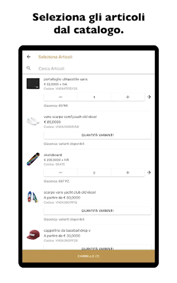 Select items from the catalog. You decide if you want to manage the actual availability of the products or not. You can also manage items with variant (eg sizes and colors). The price of the items depends on the price list of the associated customer.