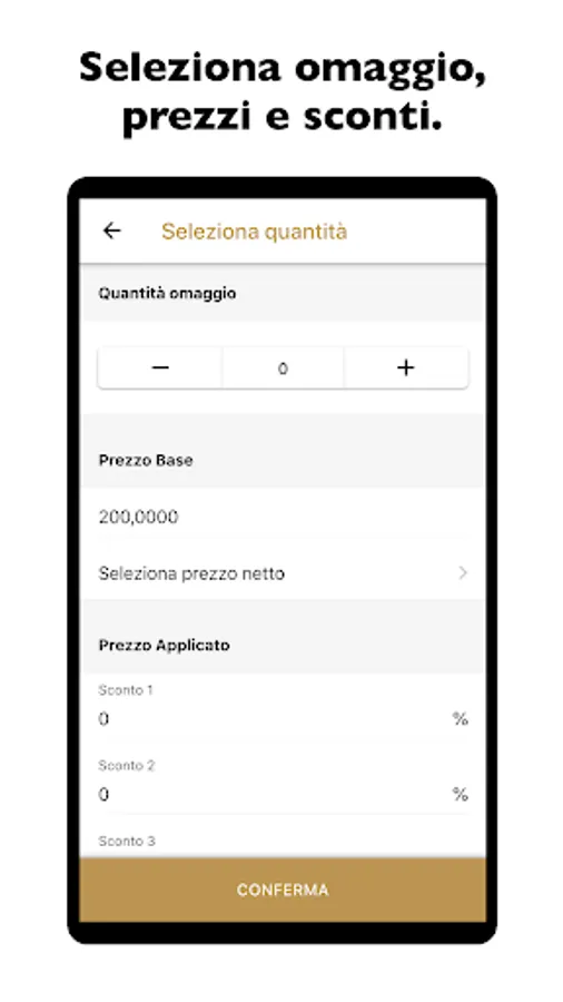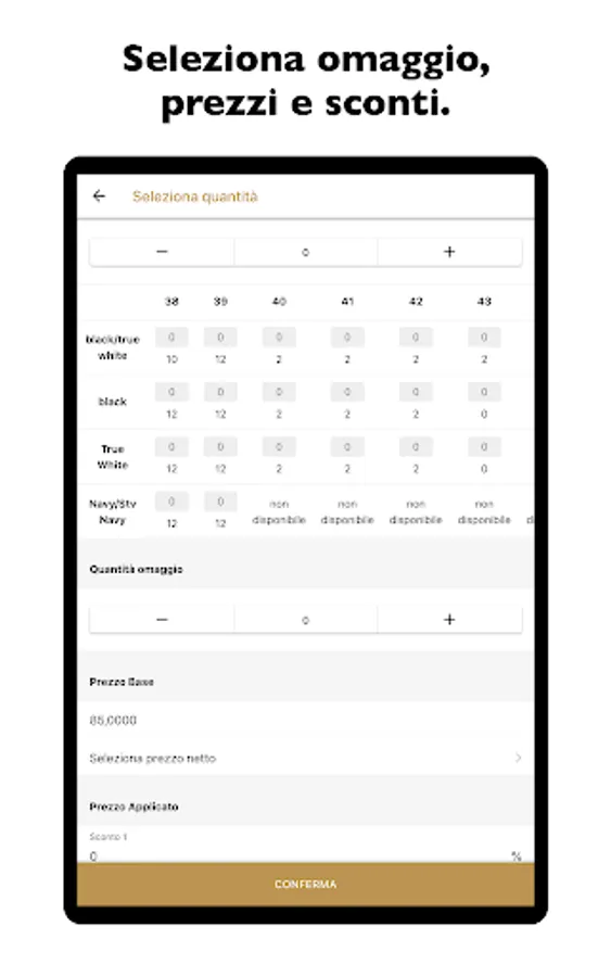 Choose the quantity of the items you want to place in the order. You can change the net price of an item and add up to three percentage discounts. Variant items can be edited very quickly with multiple selection.
