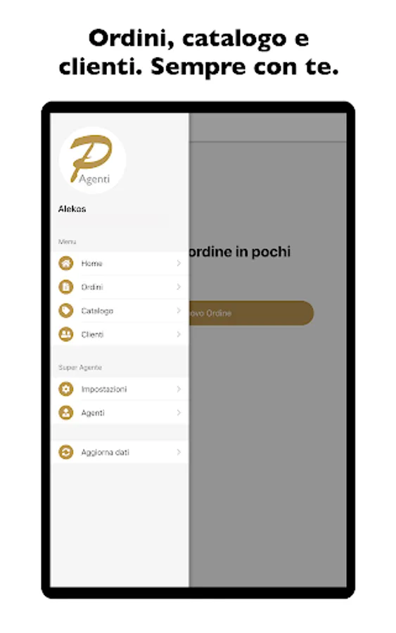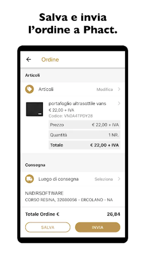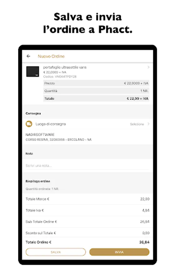 Phact Agenti is the app that allows you to take orders on the go and send them to your Phact program. Ideal for your agents, who will have at their disposal the list of their customers and the articles catalog with the price lists of the associated customers.