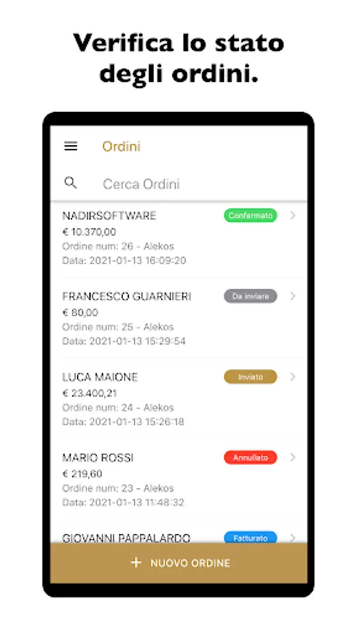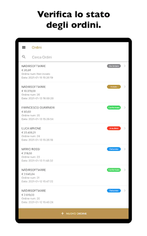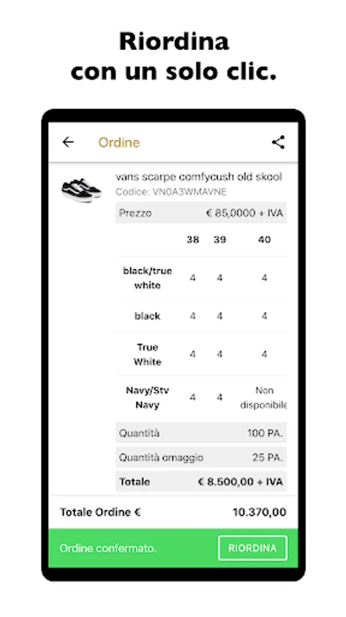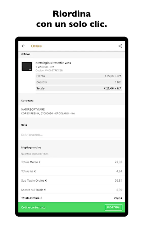 Same customer, same items, same prices? Nothing simpler! Look for the order you are interested in in the order list and press the "Reorder" button to create a new order equal to the previous one.