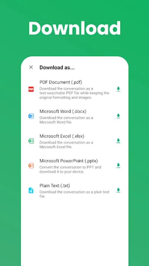 * Save chats as PDF, Microsoft Word, Excel, PPT, etc.