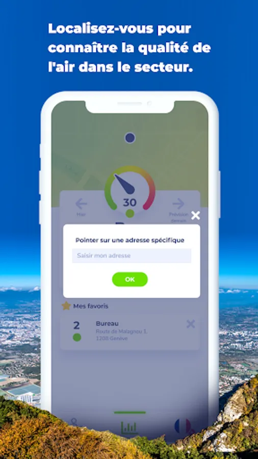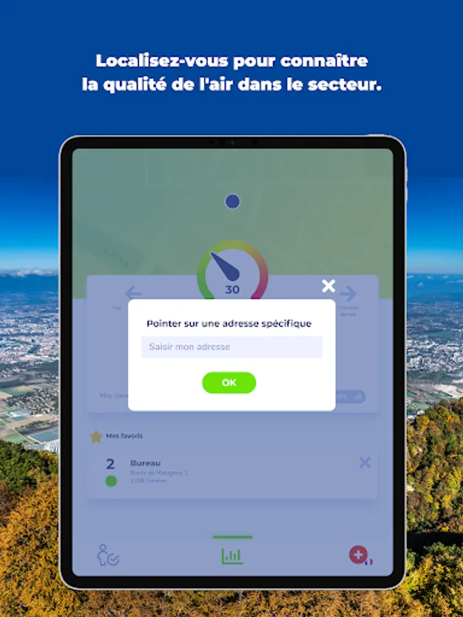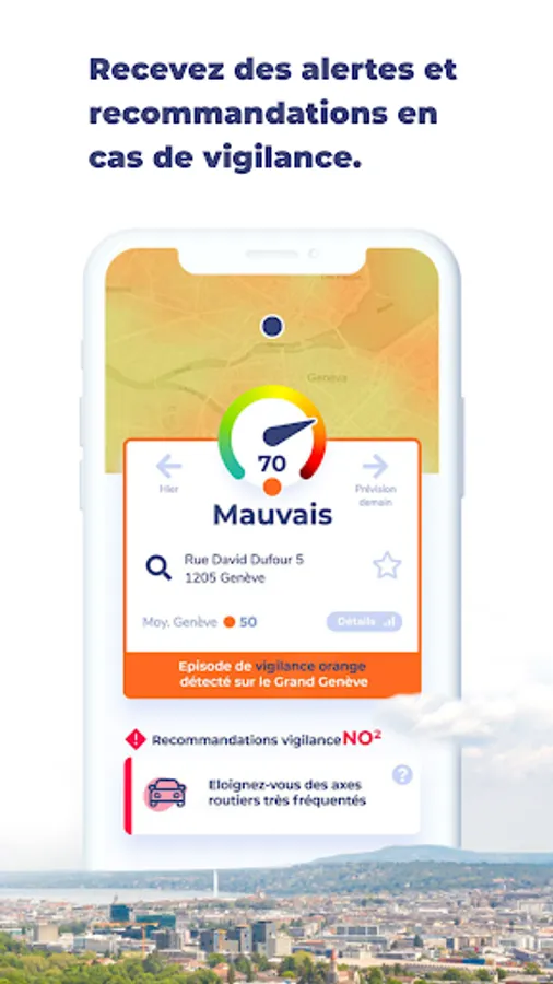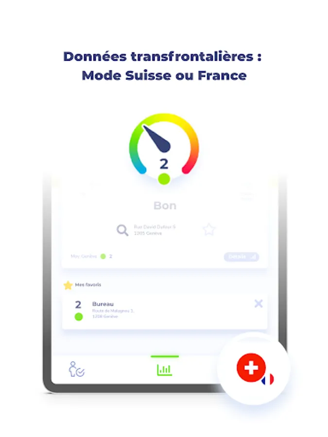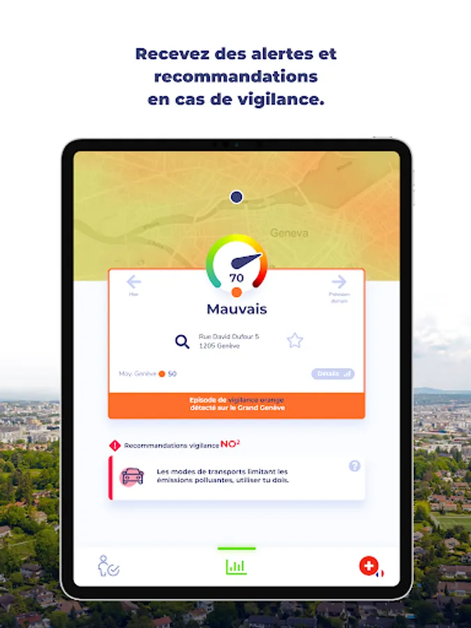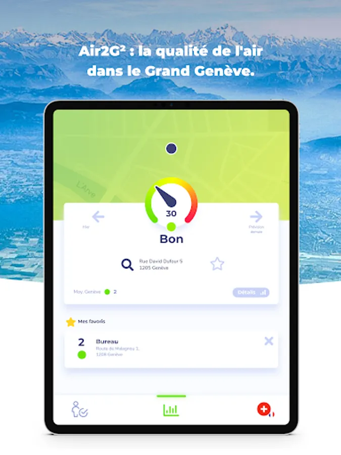 The Air2G² application is a tool allowing users to be informed daily about the air quality in Greater Geneva. The information is available in the form of maps or data from nearby measurement stations. Thanks to a system of "France-Switzerland switch" the user can choose, according to its geolocation or its preference, the daily index of air quality that appears on its screen (Swiss or French scale) . Air2G², it is also good daily recommended actions according to the majority pollutants measured. These good gestures become recommendations during periods of vigilance, that is to say when the thresholds are exceeded. In the event of pollution peaks, compulsory measures (differentiated traffic, etc.) are also indicated on the application.