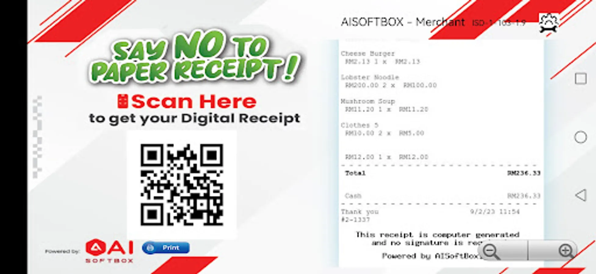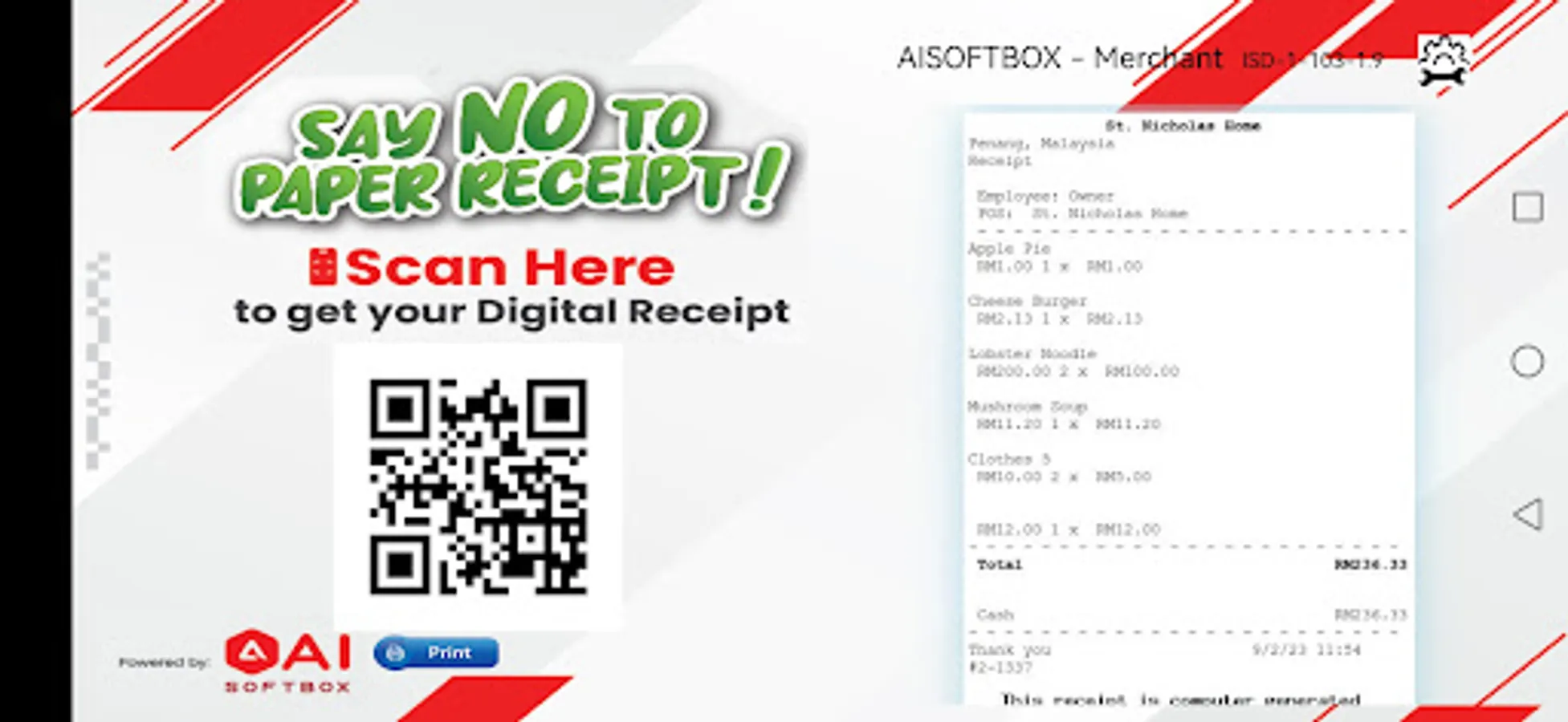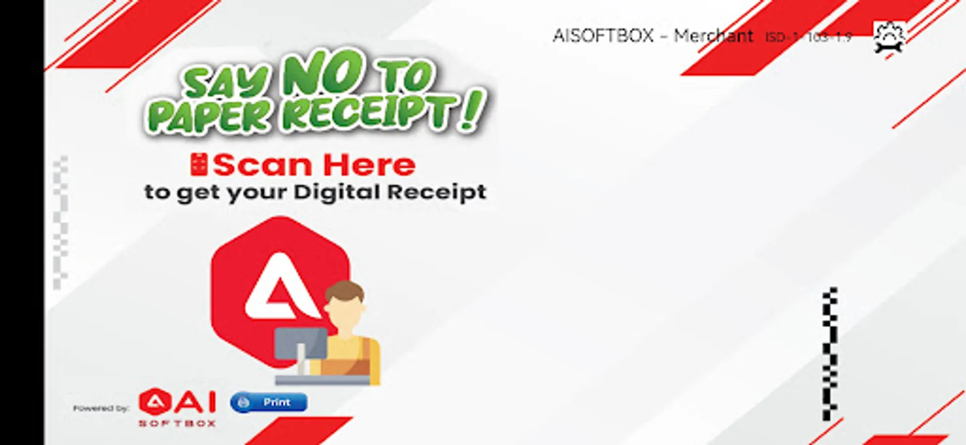 AISoftBox Merchant App turn any android tablet or digital signage into Plug-n-play display device that converts normal receipt printing data into QR codes. Customers scan the displayed QR code and receive the receipt digitally.