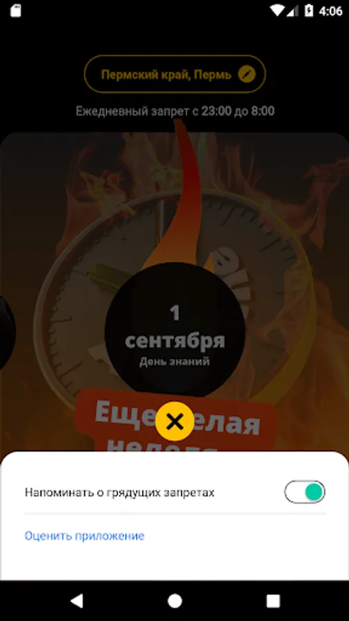 The Alcotime app helps you stay out of trouble. Install the application, select your region and city and receive notifications on the eve of all holidays in your city, the sale of alcohol in which is prohibited.