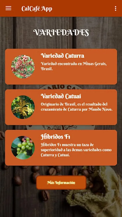 It is also complemented with other coffee knowledge options, such as approved varieties, diseases and control methods, pests that affect the crop and finally has a technical support option (For more information consult the User Manual of our Mobile Application).