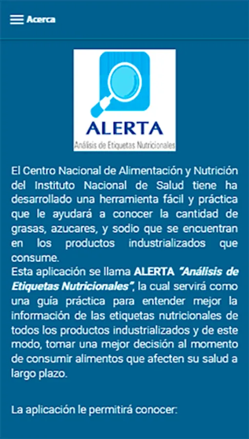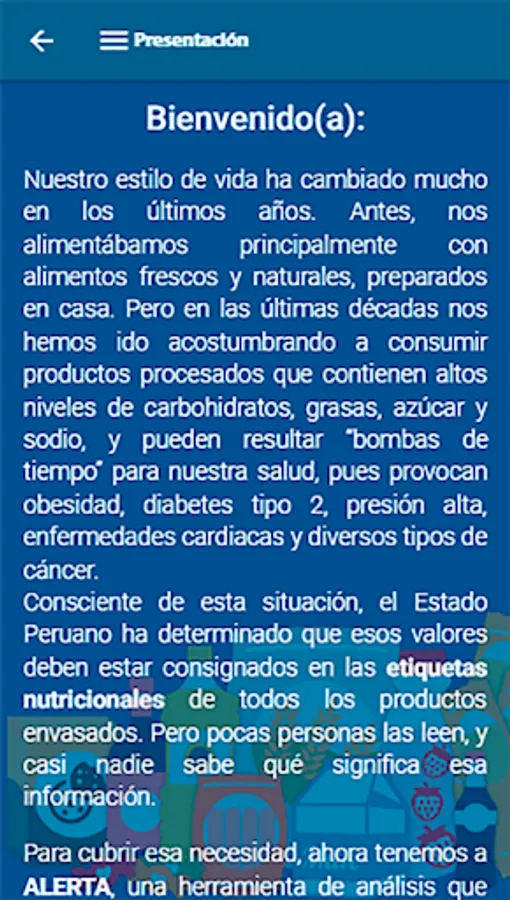 Alerta aims to provide nutritional information on the content of fats, sugars and sodium contained in industrialized products in real time through a calculation platform, which will show you warnings in case the products have a high content of these nutrients according to portion of consumption.