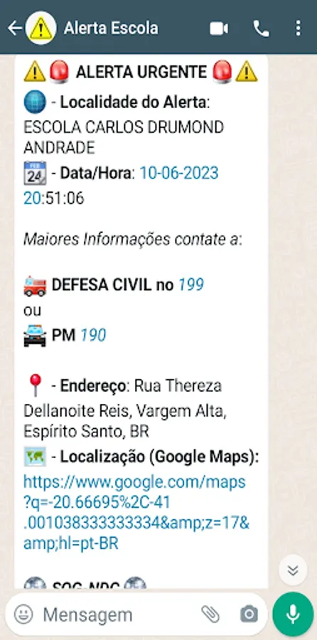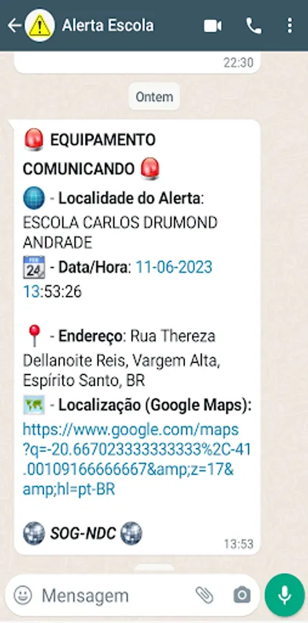 On November 25, 2022, there was an attack that shocked the city of Aracruz in Espirito Santo, so the creator of this tool “ALERTA ESCOLA” decided to disembark this tool, to respond more quickly to the need of Brazilian Schools to have a device that communicates in real time with the CIVIL DEFENSE, POLICE, SAMU, FIRE DEPARTMENTS, MAYOR AND DEPARTMENT OF EDUCATION.