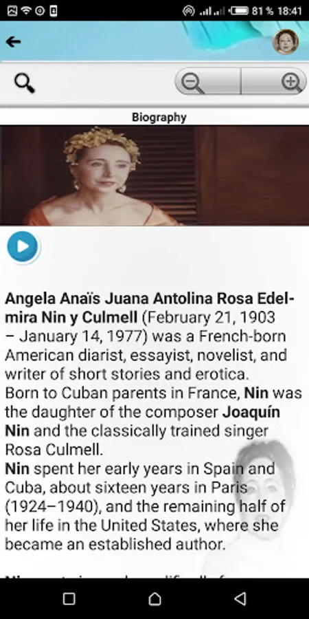 Angela Anaïs Juana Antolina Rosa Edelmira Nin y Culmell (February 21, 1903 – January 14, 1977) was a French-born American diarist, essayist, novelist, and writer of short stories and erot*ca. Born to Cuban parents in France, Nin was the daughter of the composer Joaquín Nin and the classically trained singer Rosa Culmell. Nin spent her early years in Spain and Cuba, about sixteen years in Paris (1924–1940), and the remaining half of her life in the United States, where she became an established author.
