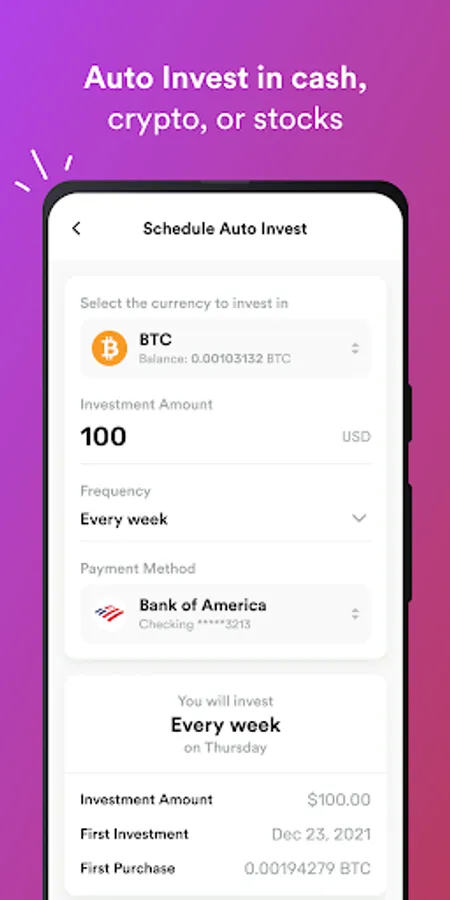 No hidden fees, no complex setups - just simple, seamless bitcoin investing and money management. Plus, our intuitive app makes it easy to track your investments and manage your portfolio on the go.