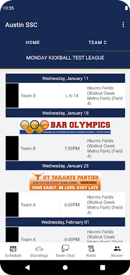 The Austin Sports & Social Club Android app allows players to get notifications (rainouts, results, league news, and more), chat with their teammates, receive discounts around town, and view team schedules & standings on their mobile device.