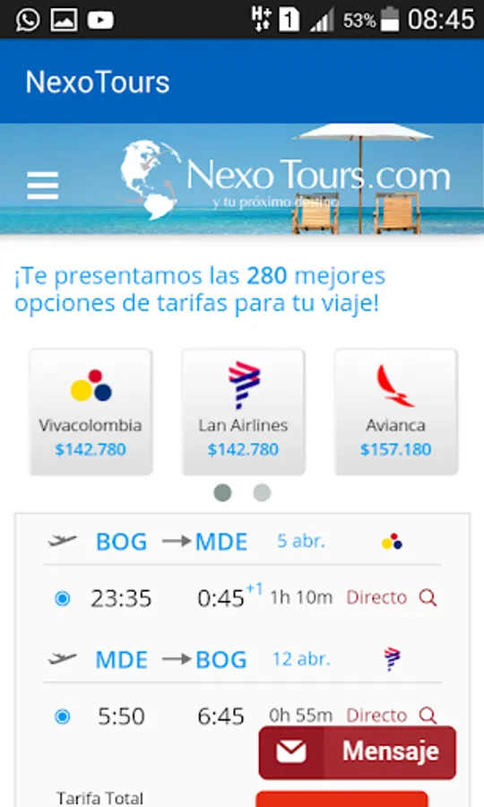 With this application you can check the availability of hotels, cars and flights in the most recognized airlines world level and most importantly, you can make online purchase of airline tickets which have stops in Colombia.