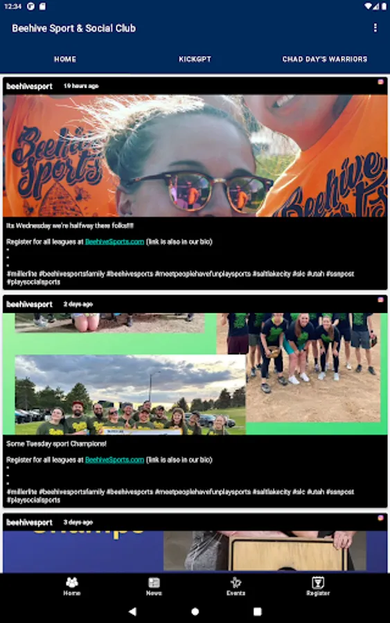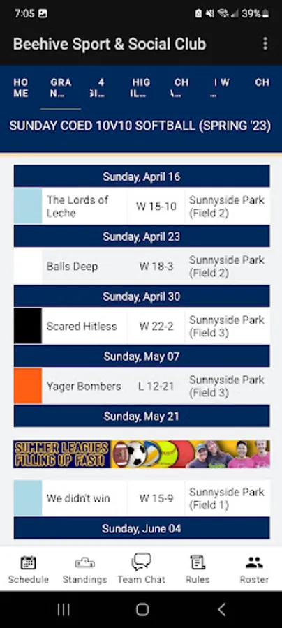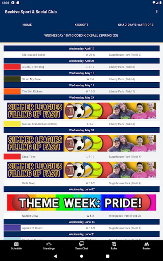The Beehive Sport & Social Club mobile app allows players to get notifications (rainouts, league news, and more), chat with their teammates, and view team schedules & standings on their device.
