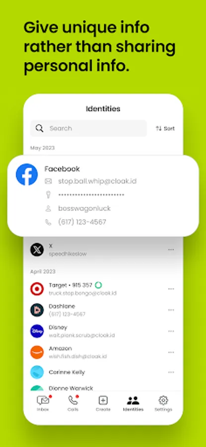 • Initiate phone calls, texts, and emails from within the app. Your incoming messages and calls will appear as the identity you've selected! You can choose to keep your communications in the Cloaked Dashboard / App or forward communications to any preferred email or native text client without revealing your personal info.