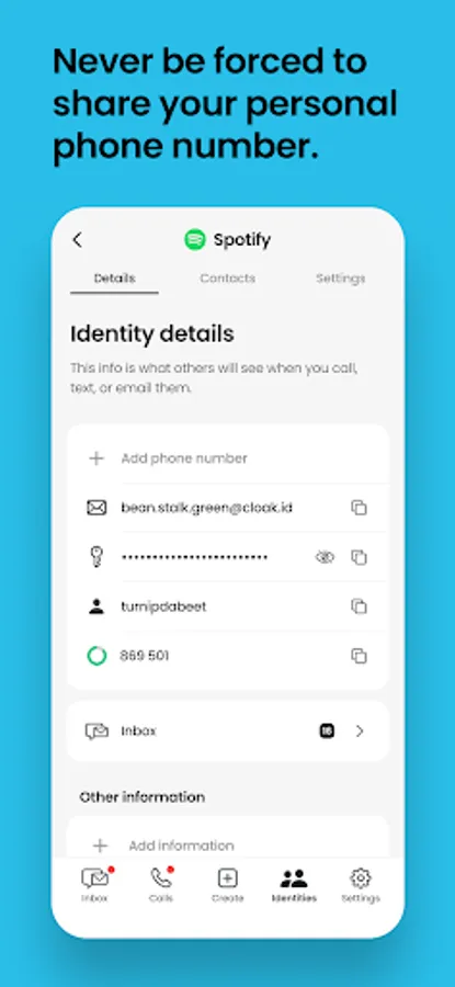 • Use the mobile app to generate unlimited emails, phone numbers*, passwords, and usernames.