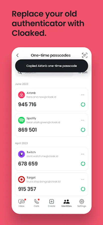 • Your authenticator codes sync across your Cloaked account and logged in devices. This way, you can always access them even if you lose your phone.