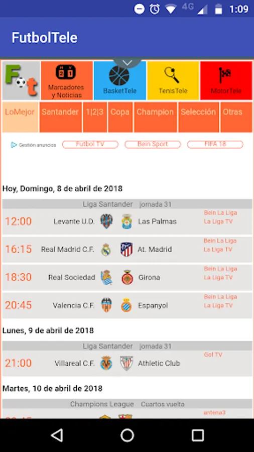 FootballTV Tele (soccerTV) lets you know the schedule and channel that is televised football game of your favorite team in the Spanish Liga and the national team of Spain (La Roja). They include the following competitions: