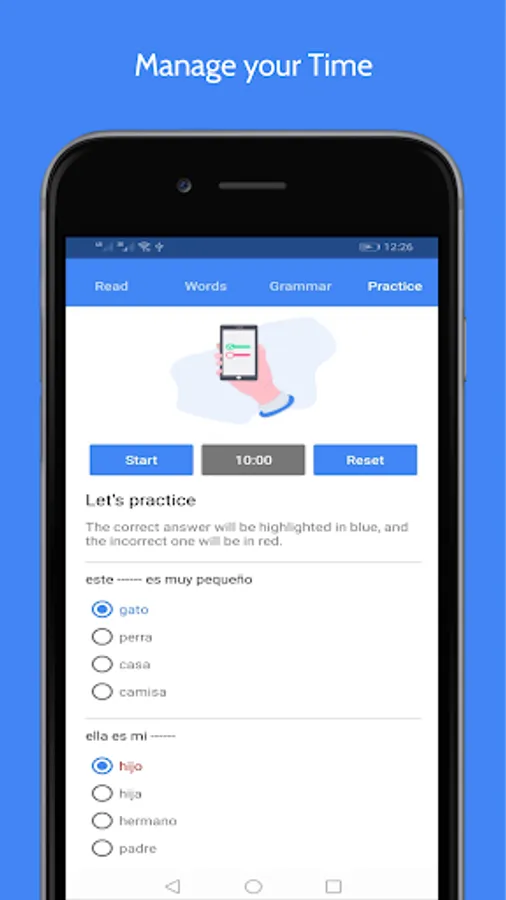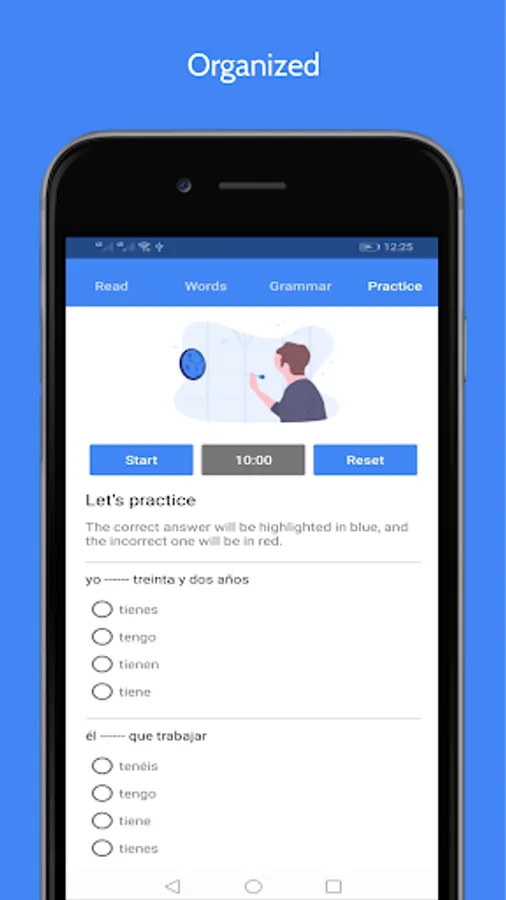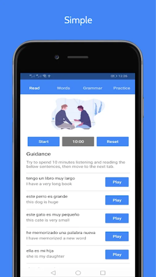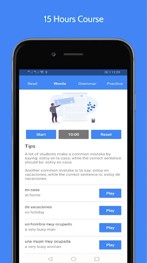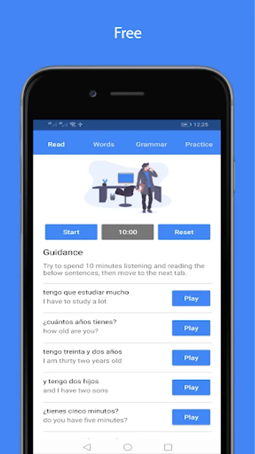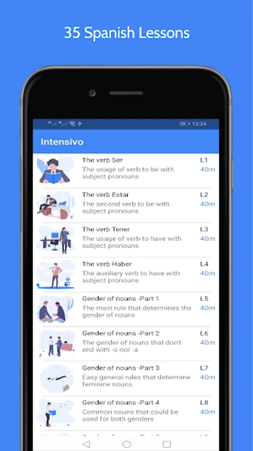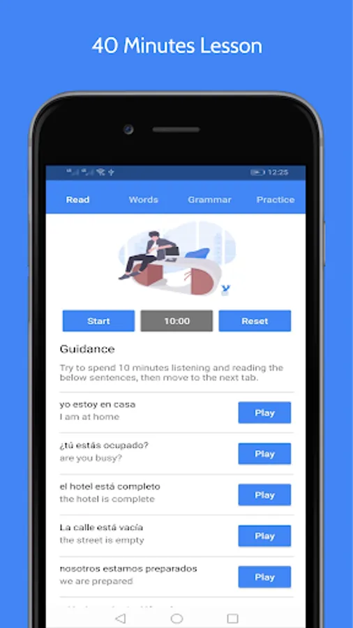 ▪ Our App contains 35 Offline Basic Audio Lessons to learn Spanish, These Lessons come into 4 Sections or 4 Tabs, they work totally Offline and designed especially for Beginners; you should spend 10 minutes on each Tab to learn how to speak Spanish, read it, Basic Grammar, Sentences, Words, and Pronunciation.